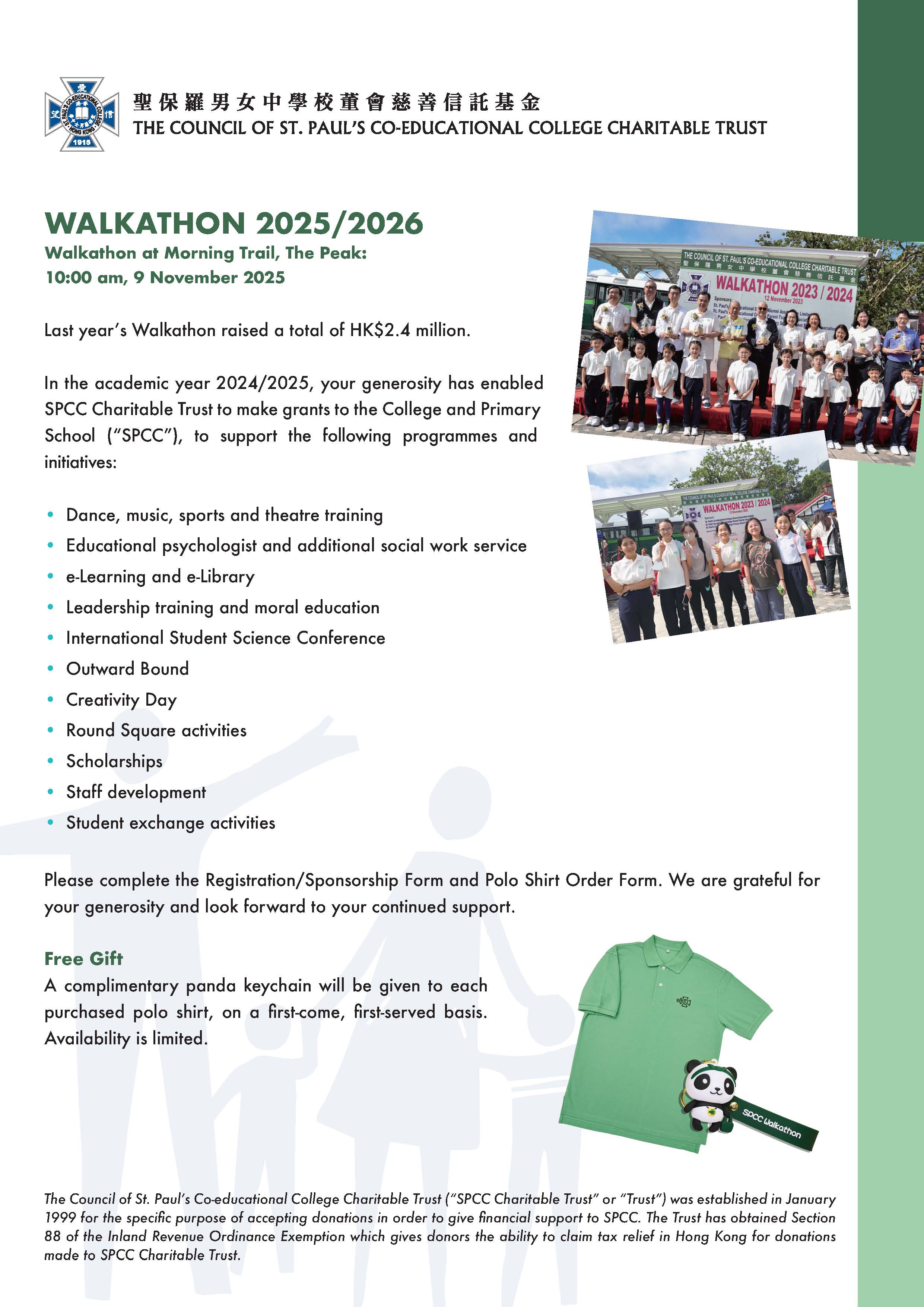 Proudly organised by The Council of St. Paul’s Co-educational College Charitable Trust, and with the generous support of the Alumni Association and the Parent-Teacher Associations, the annual Walkathon will be held on Sunday, 9 November 2025, 10am at the Morning Trail, The Peak.